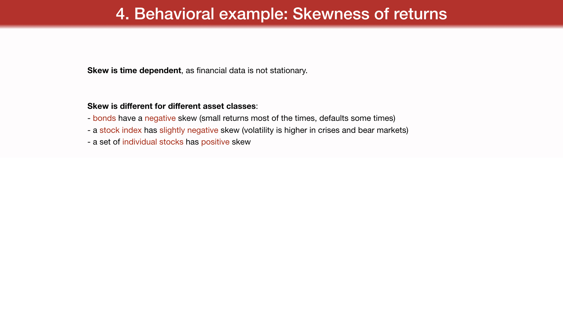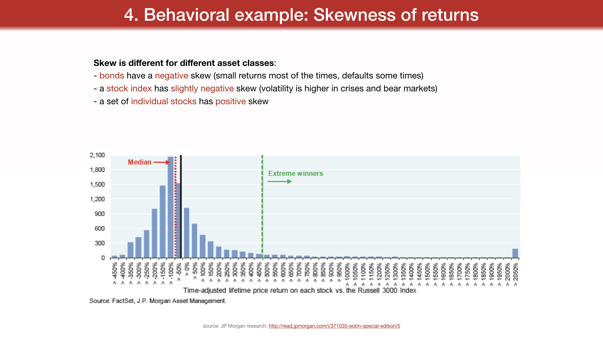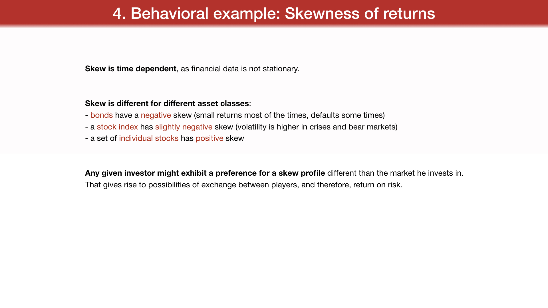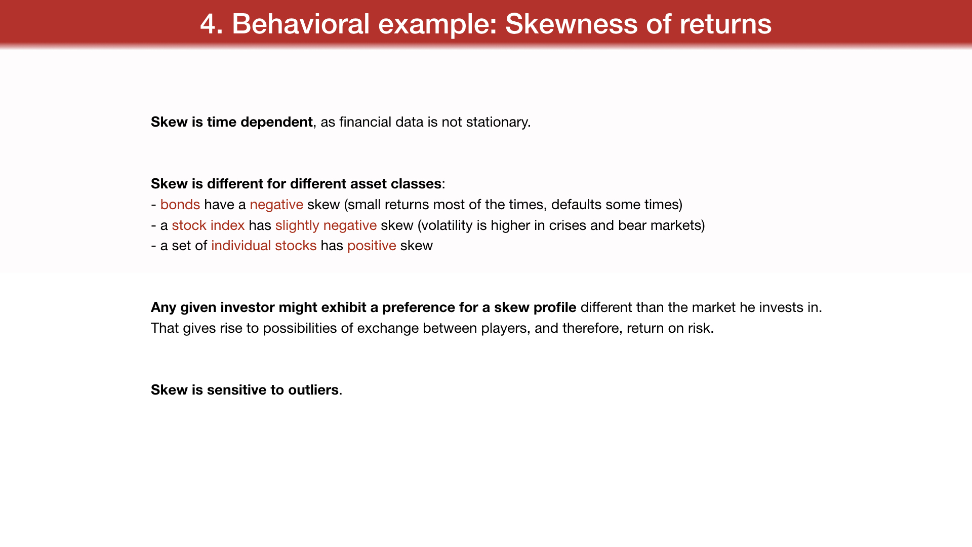4. Behavioral example: Skewness of returns 5. Factor investing