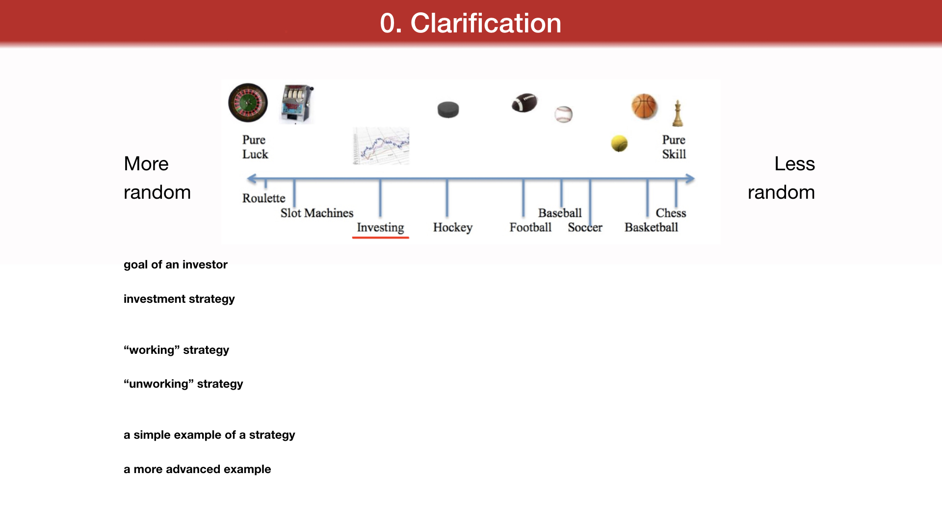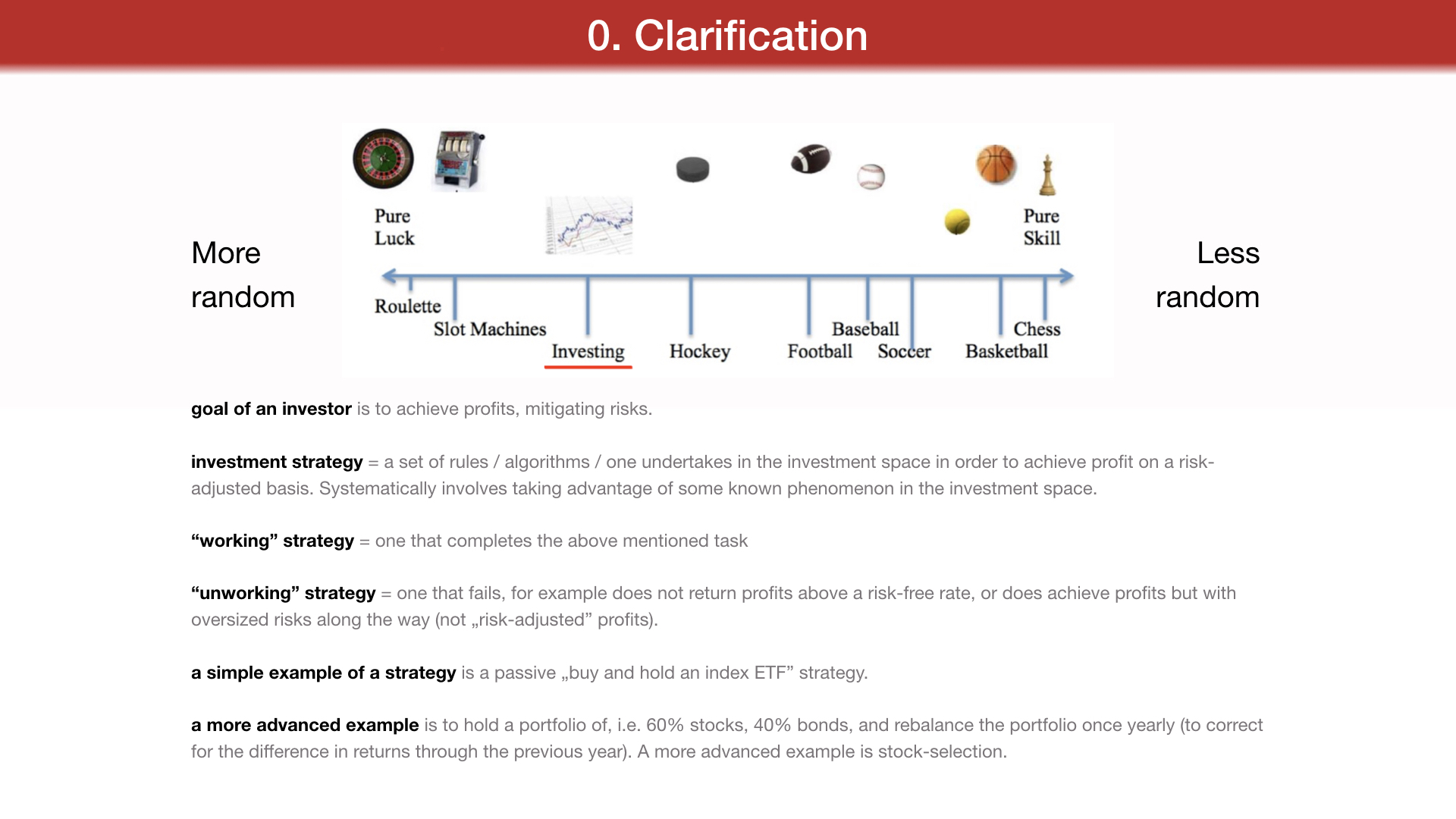investment strategy = a set of rules / algorithms / one undertakes in the investment space in order to achieve profit on a risk-