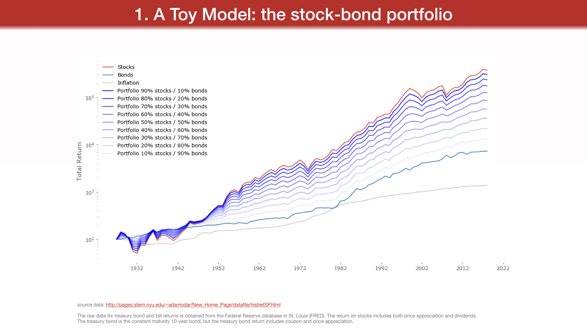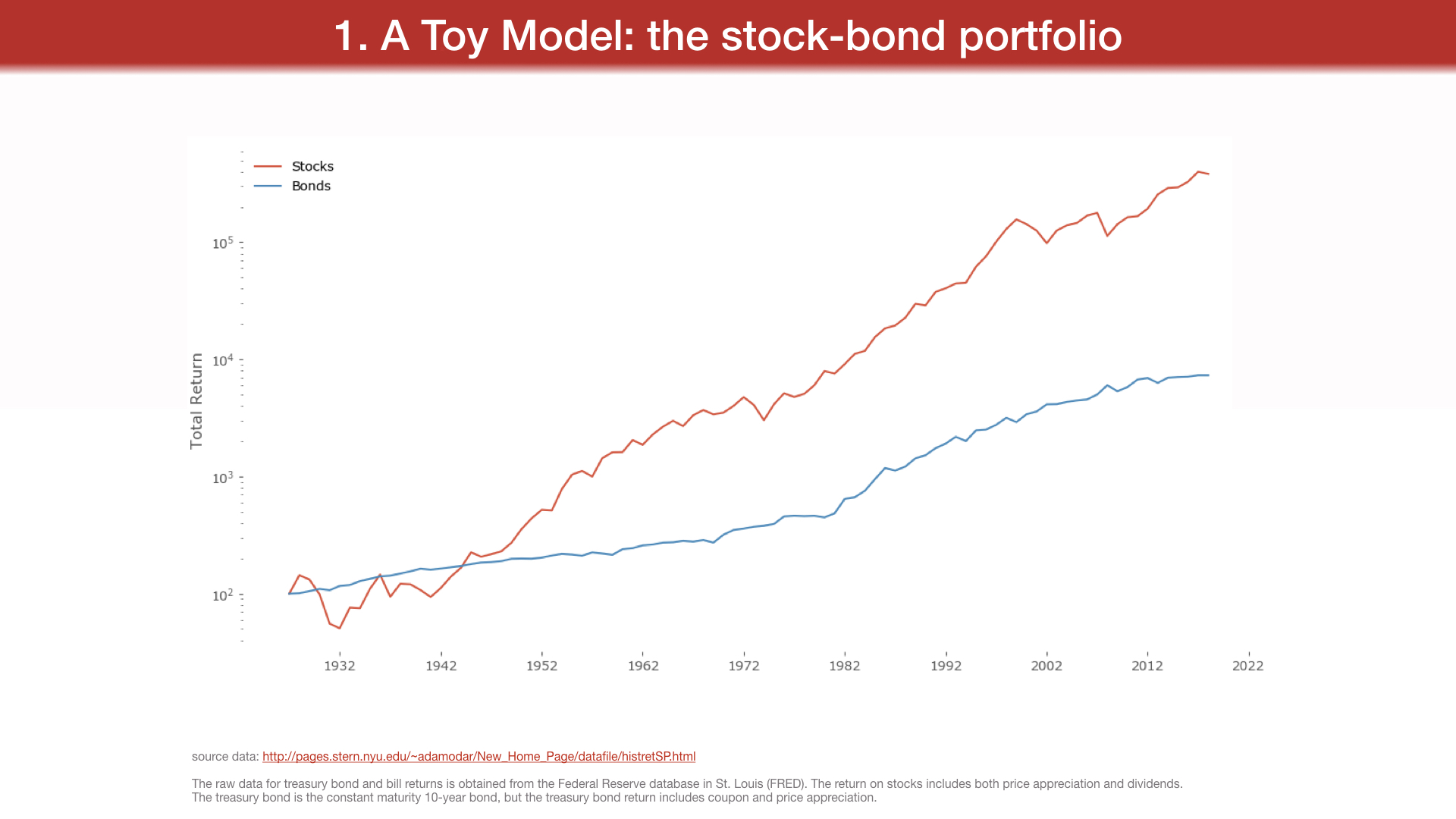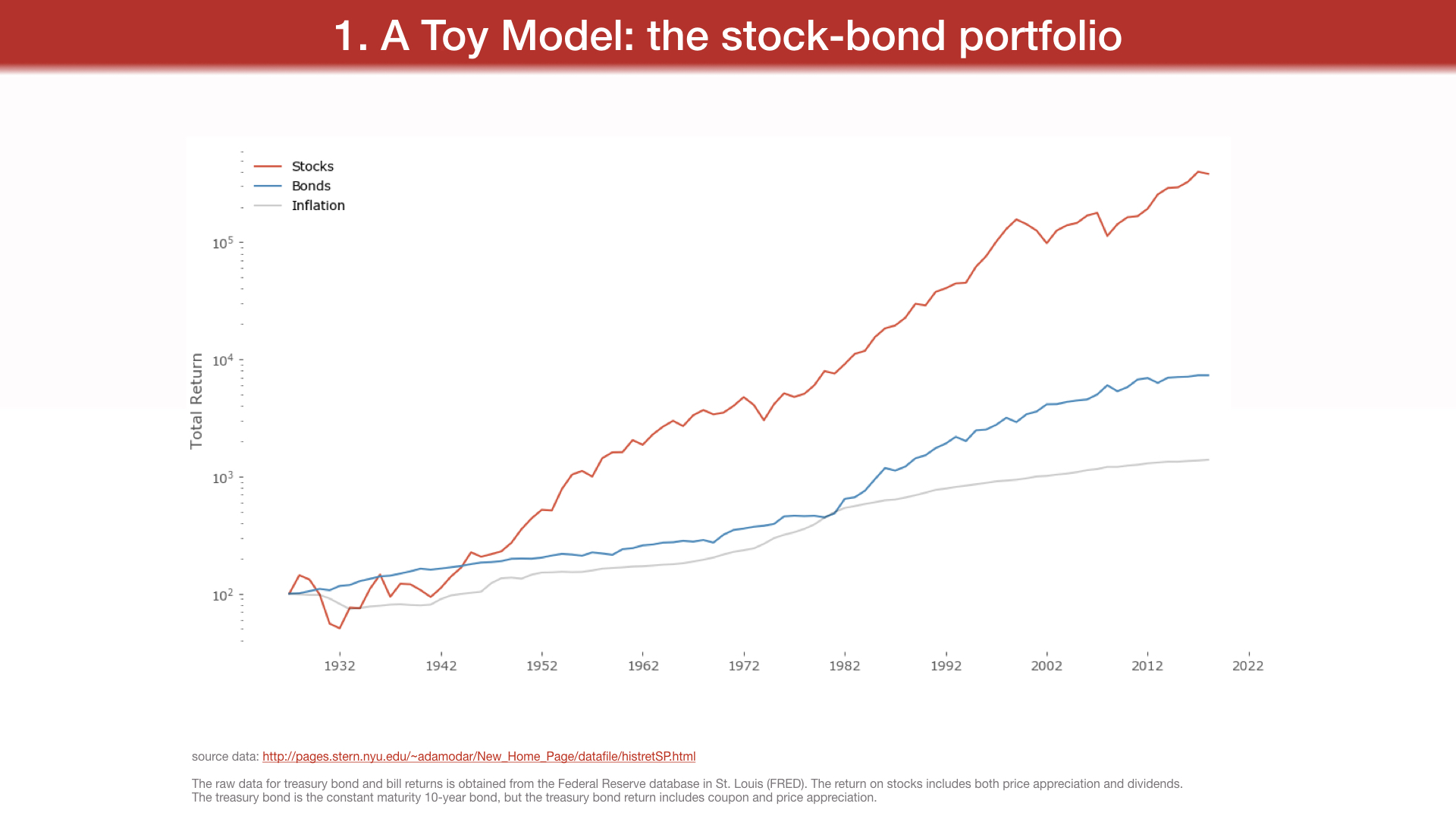 The raw data for treasury bond and bill returns is obtained from the Federal Reserve database in St. Louis (FRED). The return on stocks includes both price appreciation and dividends. The treasury bond is the constant maturity 10-year bond, but the treasury bond return includes coupon and price appreciation.