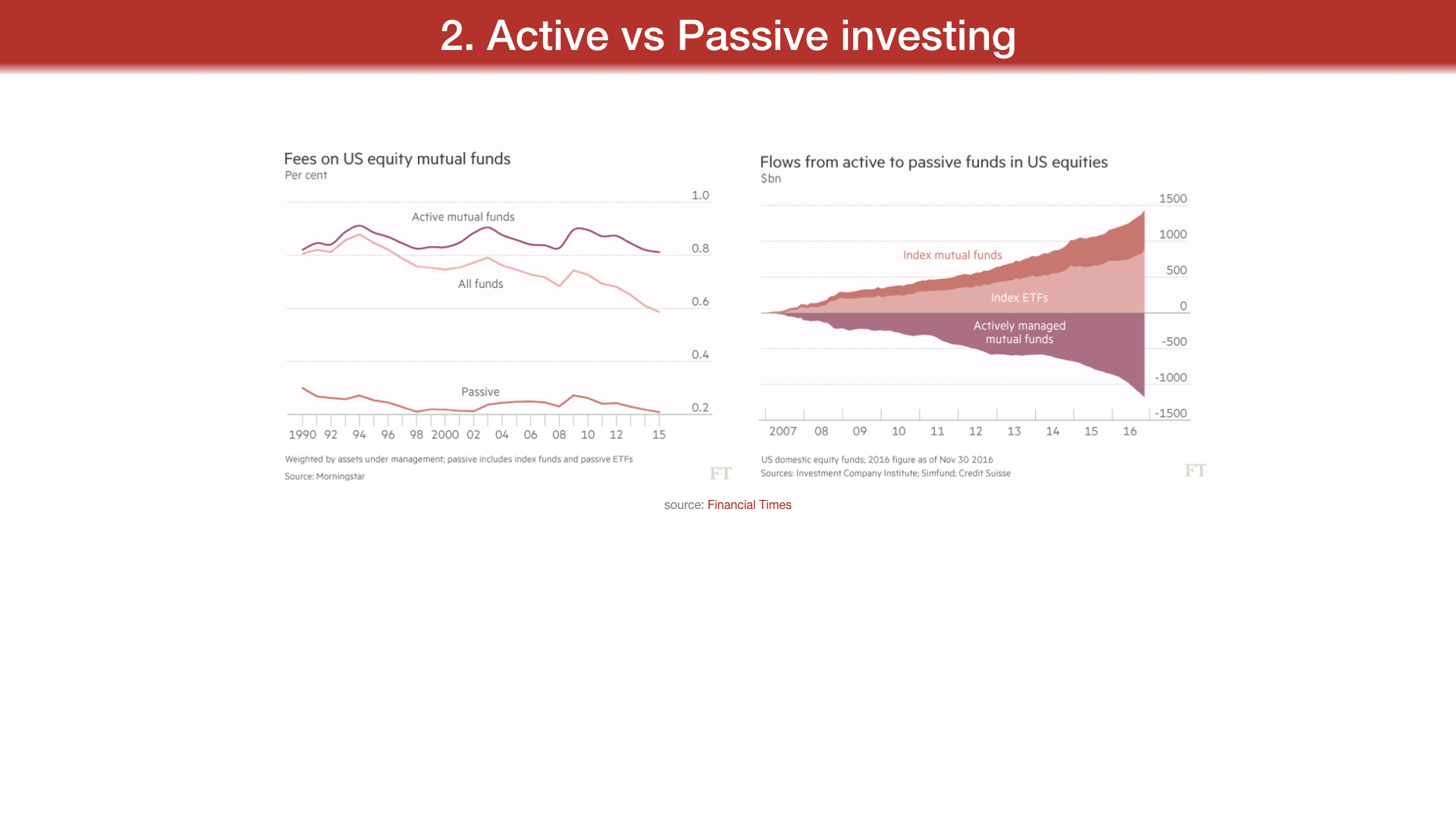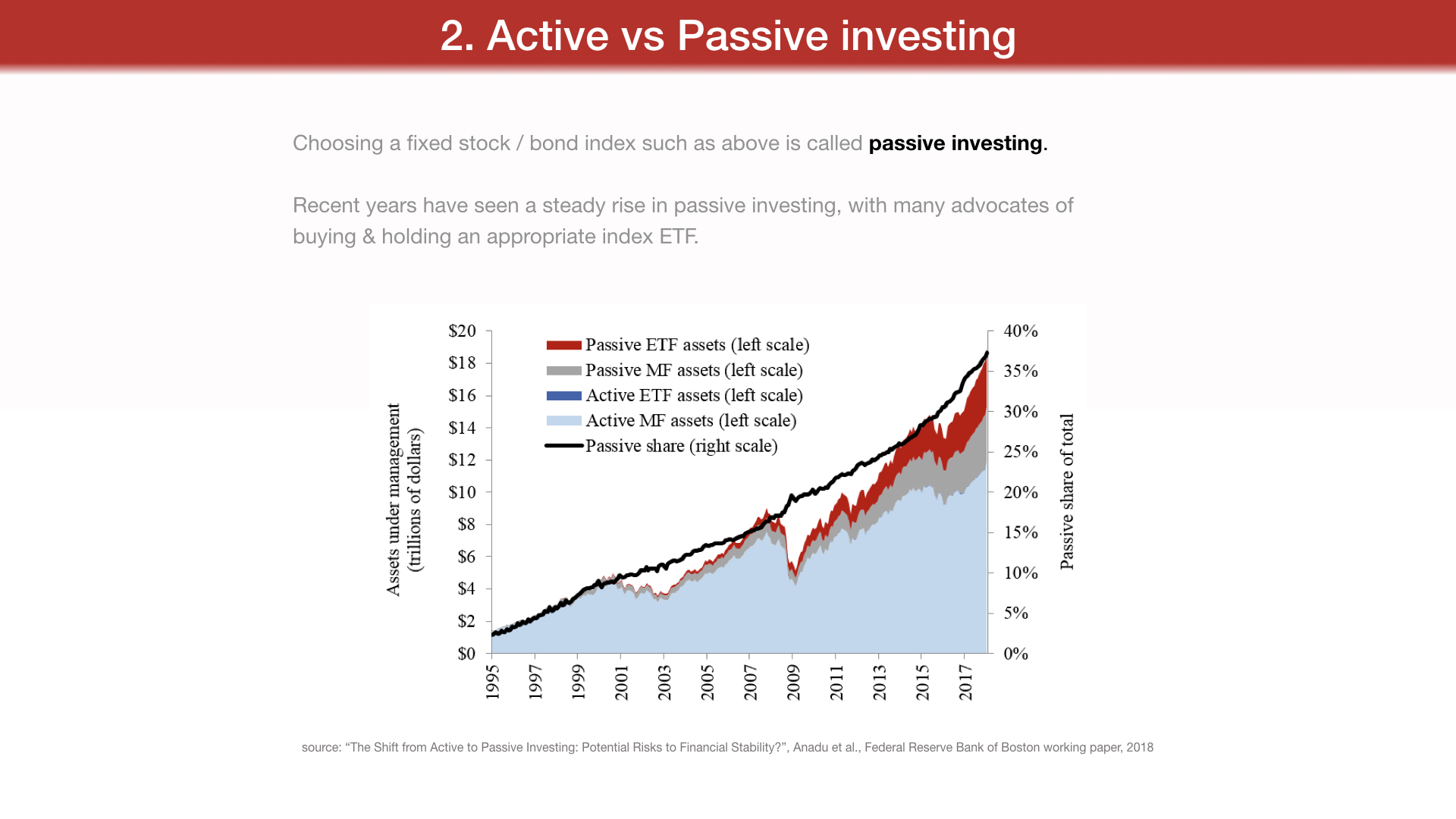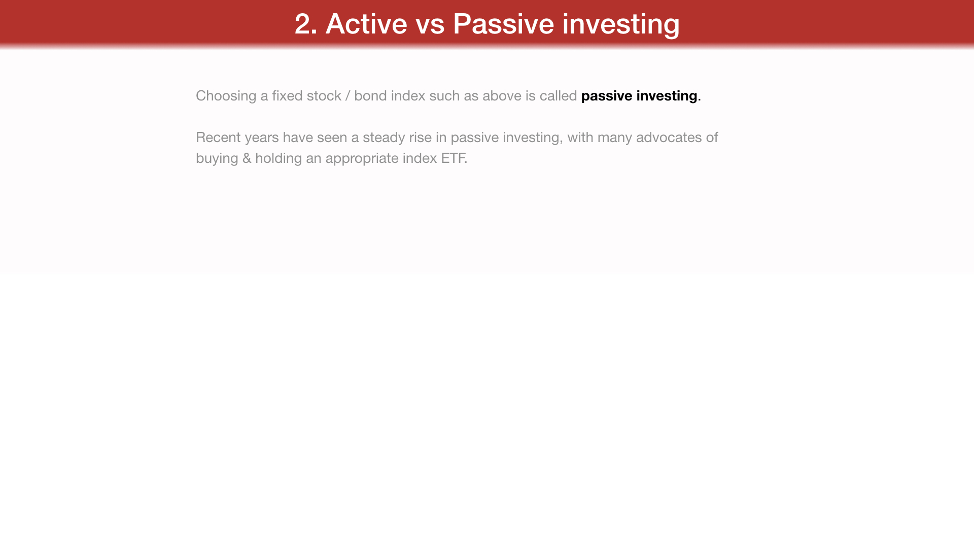 Choosing a fixed stock / bond index such as above is called passive investing. Recent years have seen a steady rise in passive investing, with many advocates of