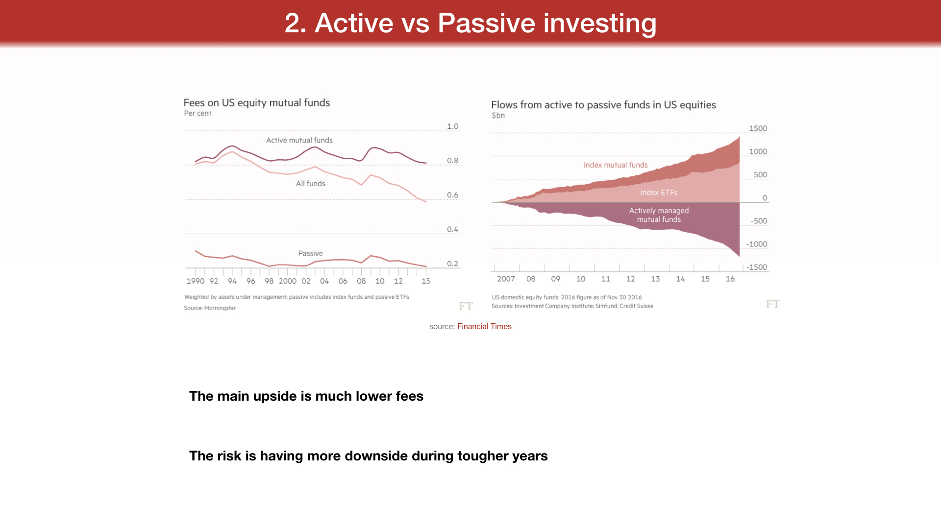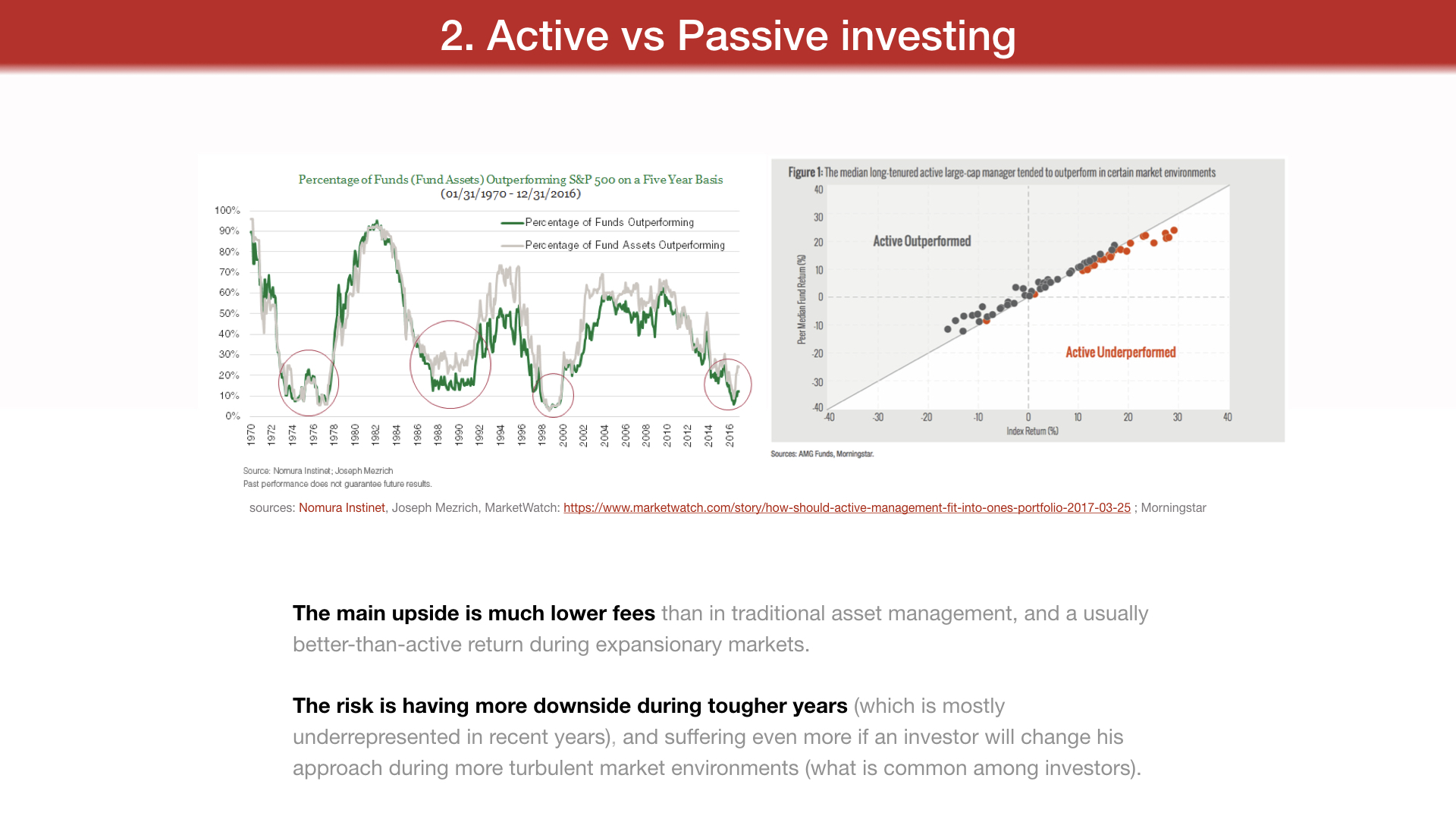 The main upside is much lower fees than in traditional asset management, and a usually better-than-active return during expansionary markets.