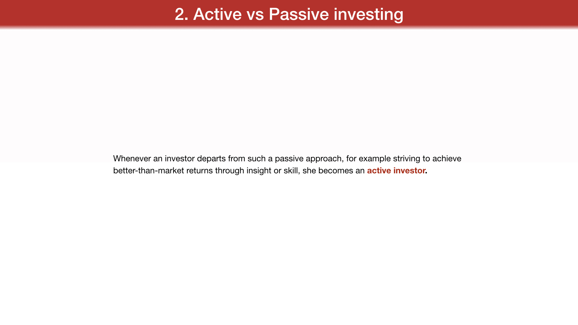 Whenever an investor departs from such a passive approach, for example striving to achieve better-than-market returns through insight or skill, she becomes an active investor.