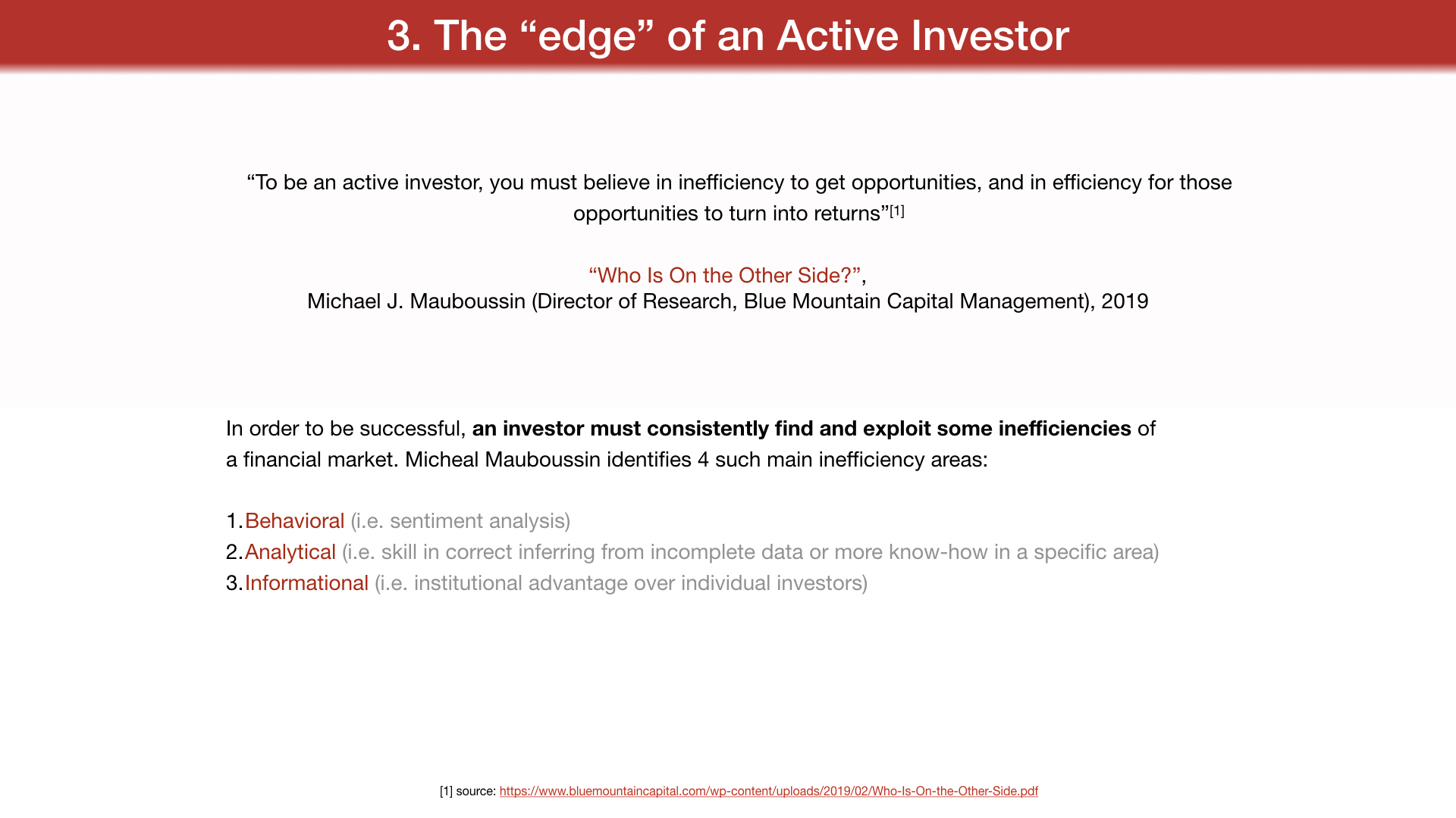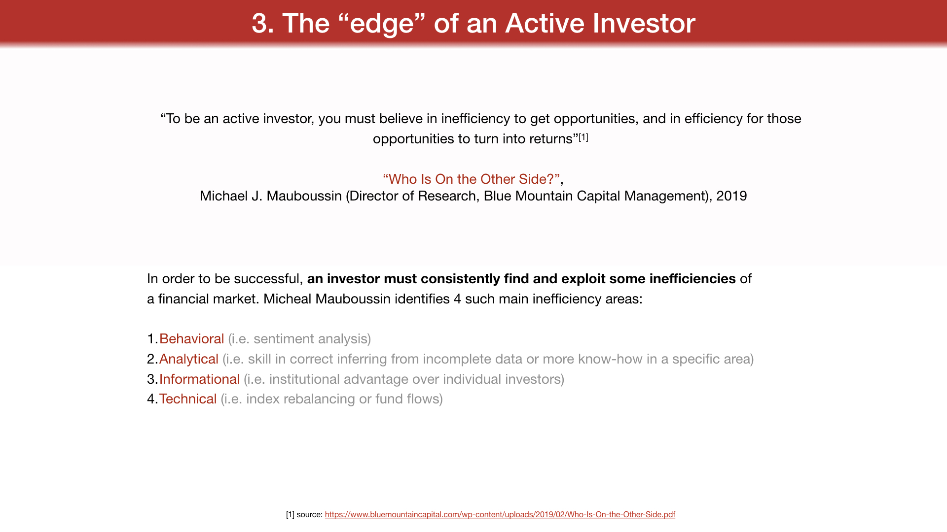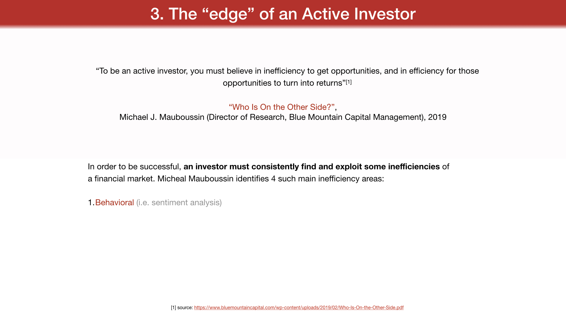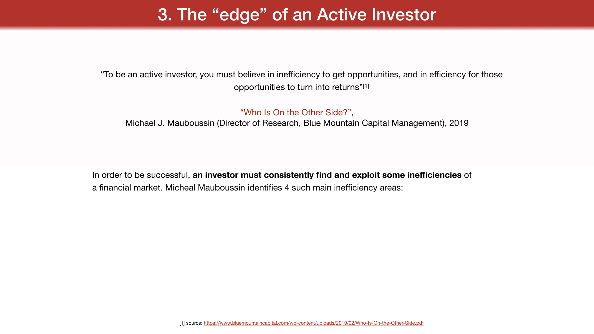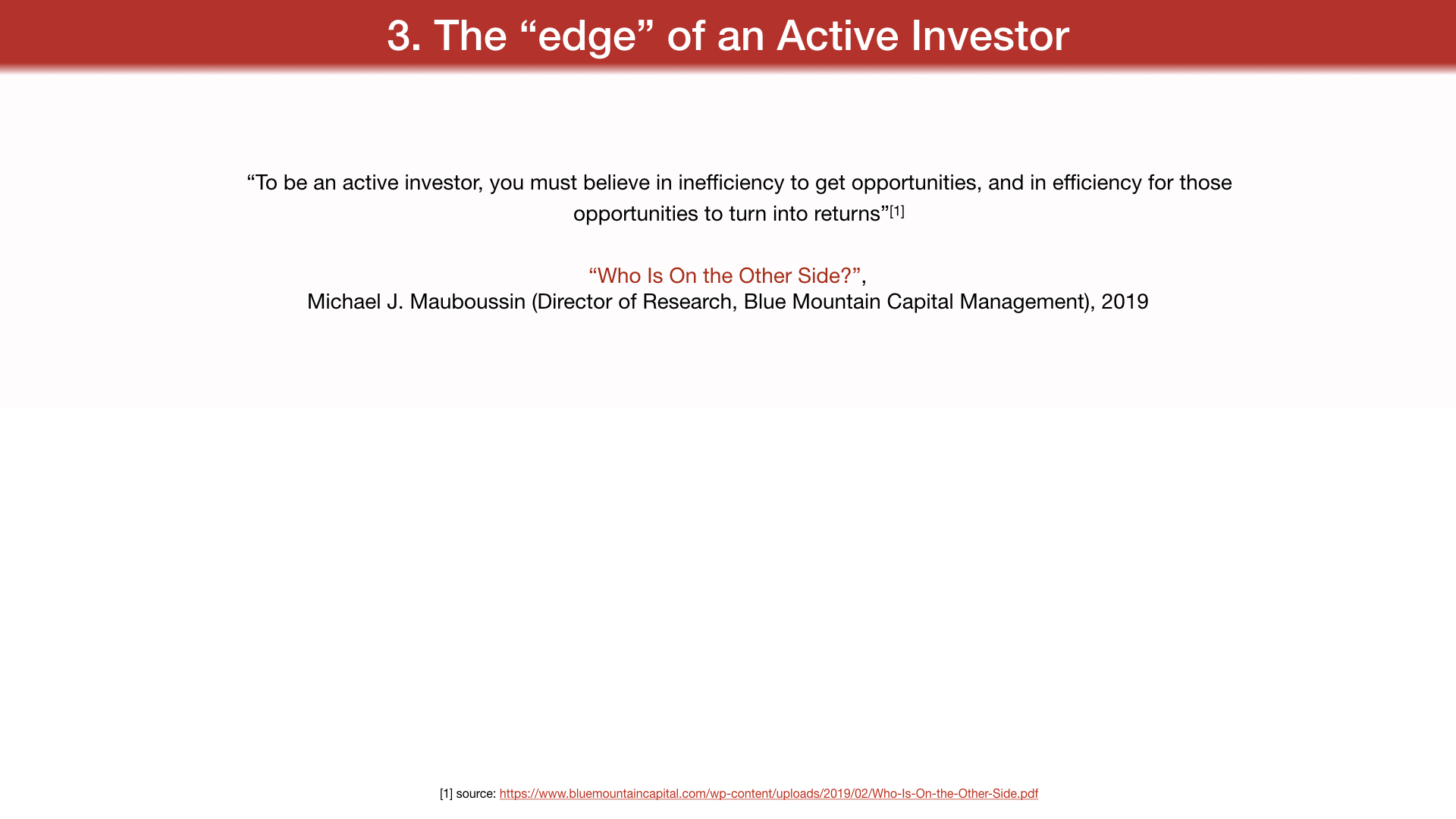 "Who Is On the Other Side?" by Michael J. Mauboussin, Director of Research, Blue Mountain Capital Management. A perfect starting point in discussing sources of potential advantages to active investing.