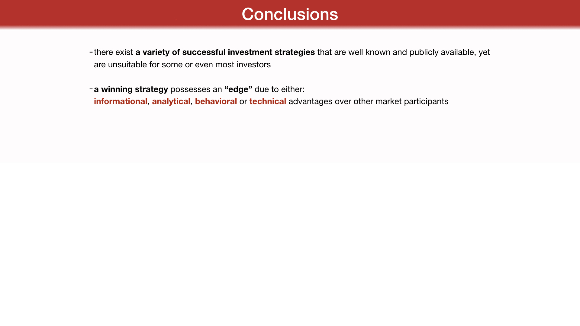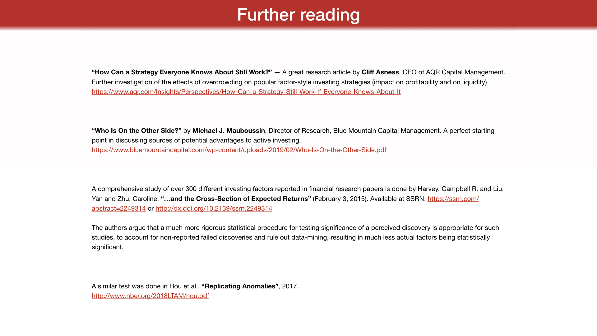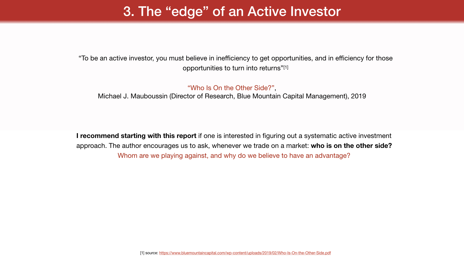 I recommend starting with this report if one is interested in figuring out a systematic active investment approach. The author encourages us to ask, whenever we trade on a market: who is on the other side? Whom are we playing against, and why do we believe to have an advantage?