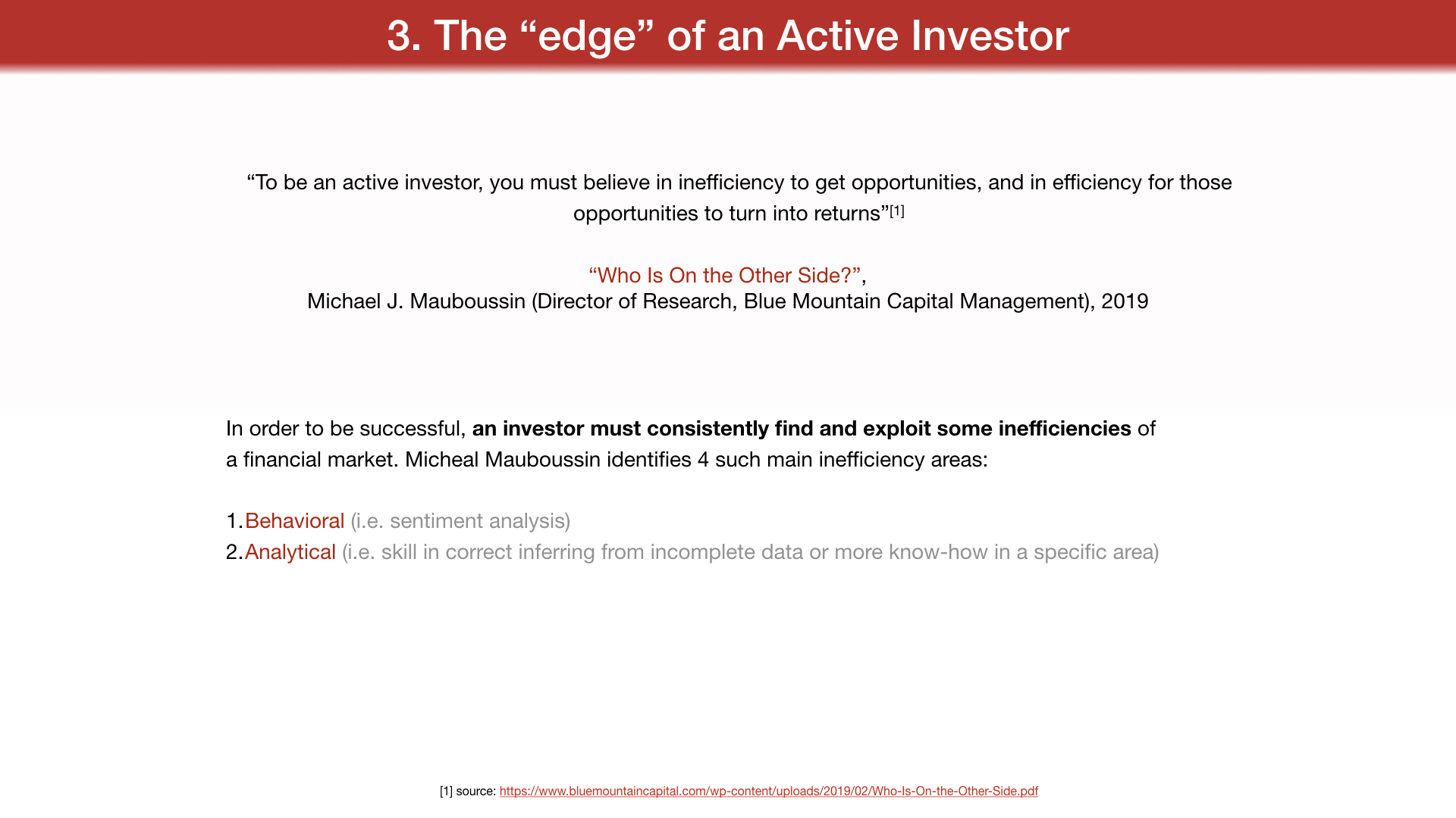 "To be an active investor, you must believe in inefficiency to get opportunities, and in efficiency for those opportunities to turn into returns"[1]