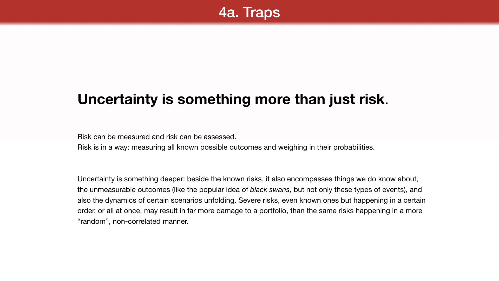 Uncertainty is something deeper: beside the known risks, it also encompasses things we don't know about, the unmeasurable outcomes (like the popular idea of black swans, but not only these types of events), and also the dynamics of certain scenarios unfolding. Severe risks, even known ones but happening in a certain order, or all at once, may result in far more damage to a portfolio, than the same risks happening in a more "random", non-correlated manner.