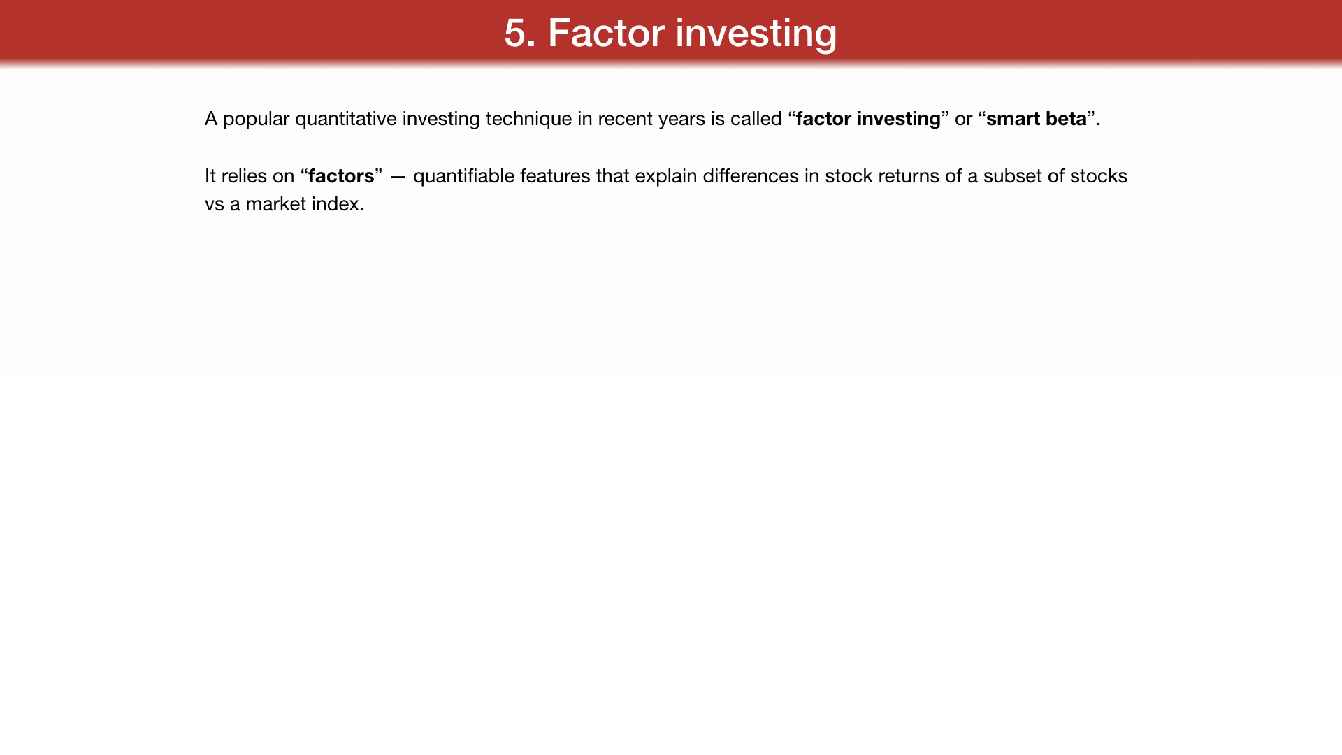 A popular quantitative investing technique in recent years is called "factor investing" or "smart beta".