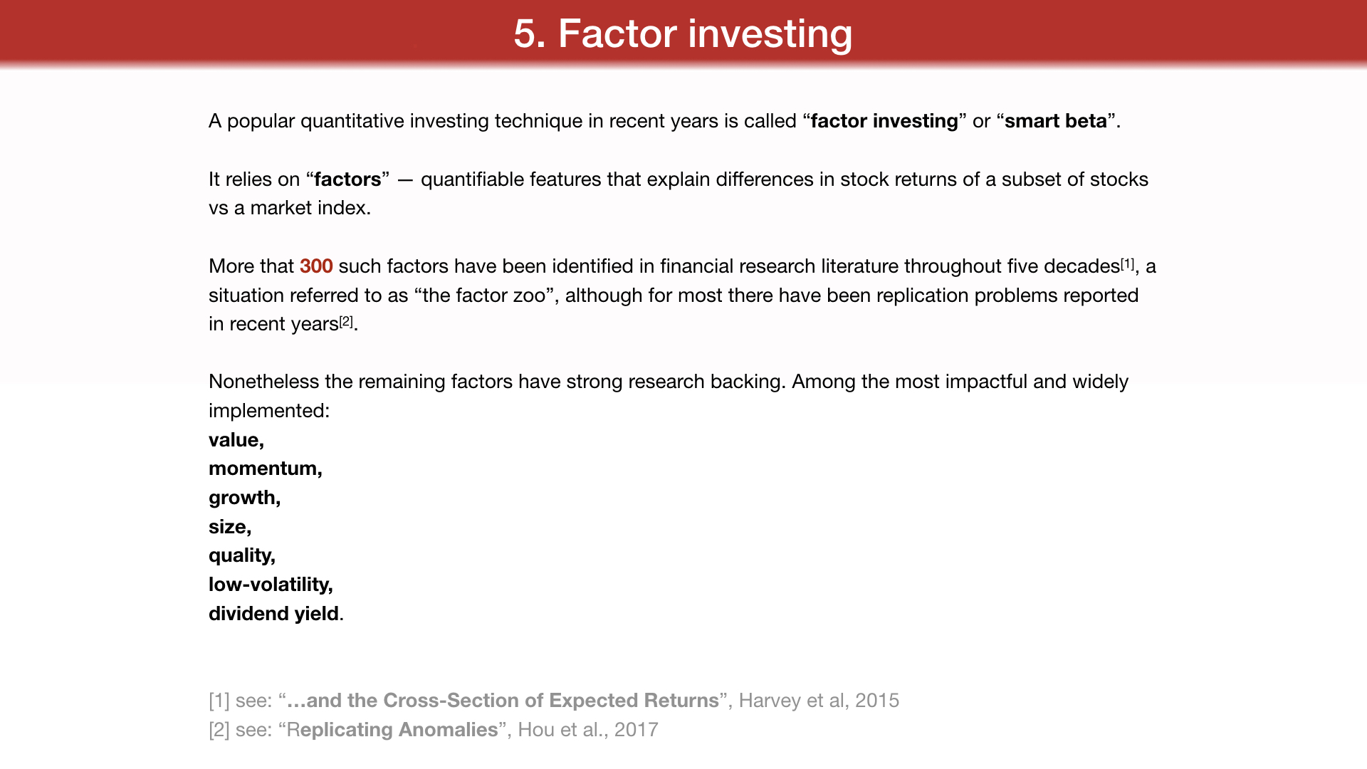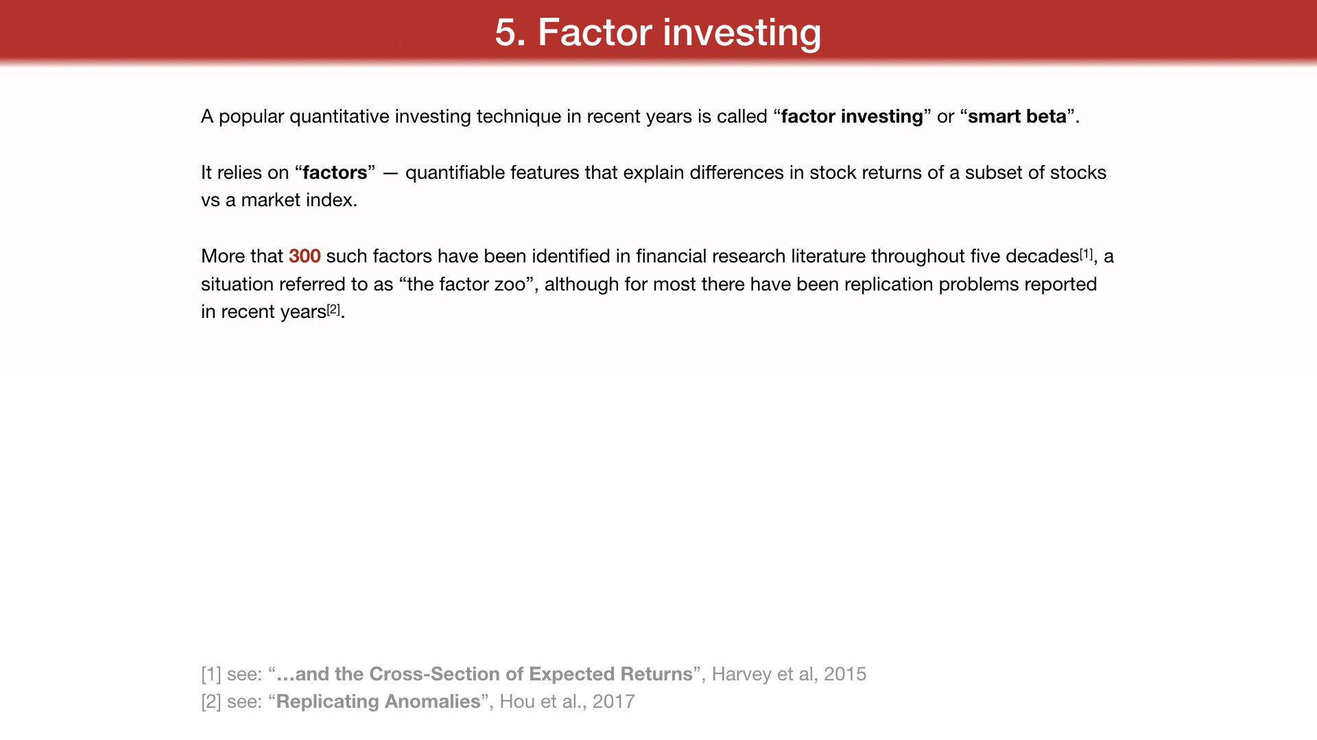 More that 300 such factors have been identified in financial research literature throughout five decades[1], a situation referred to as "the factor zoo", although for most there have been replication problems reported in recent years[2].