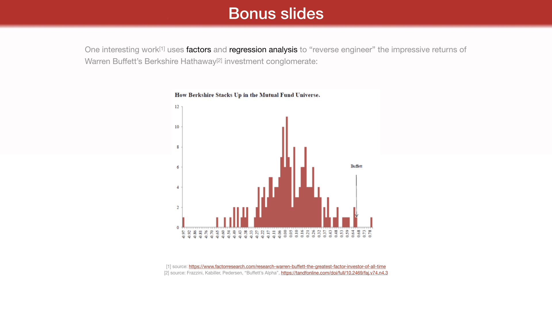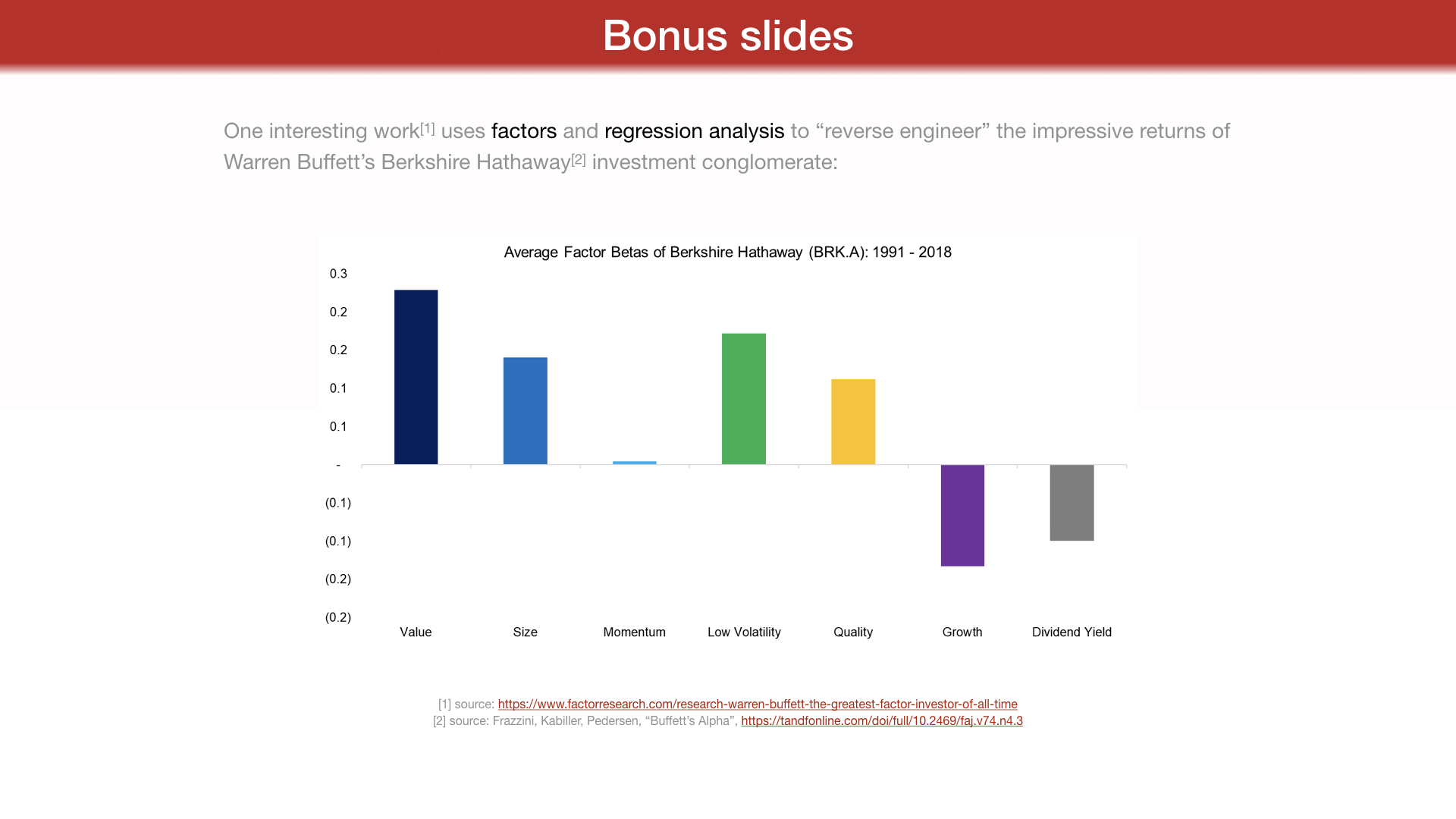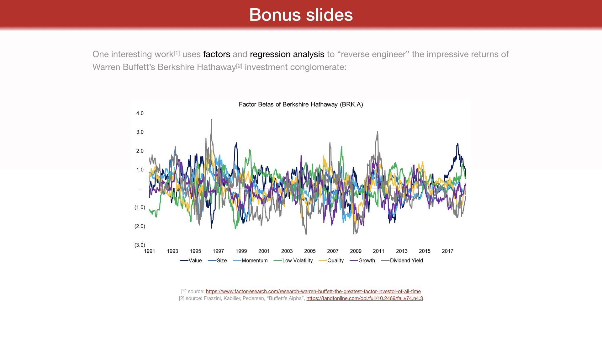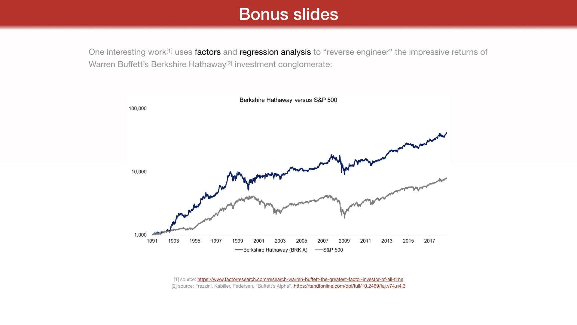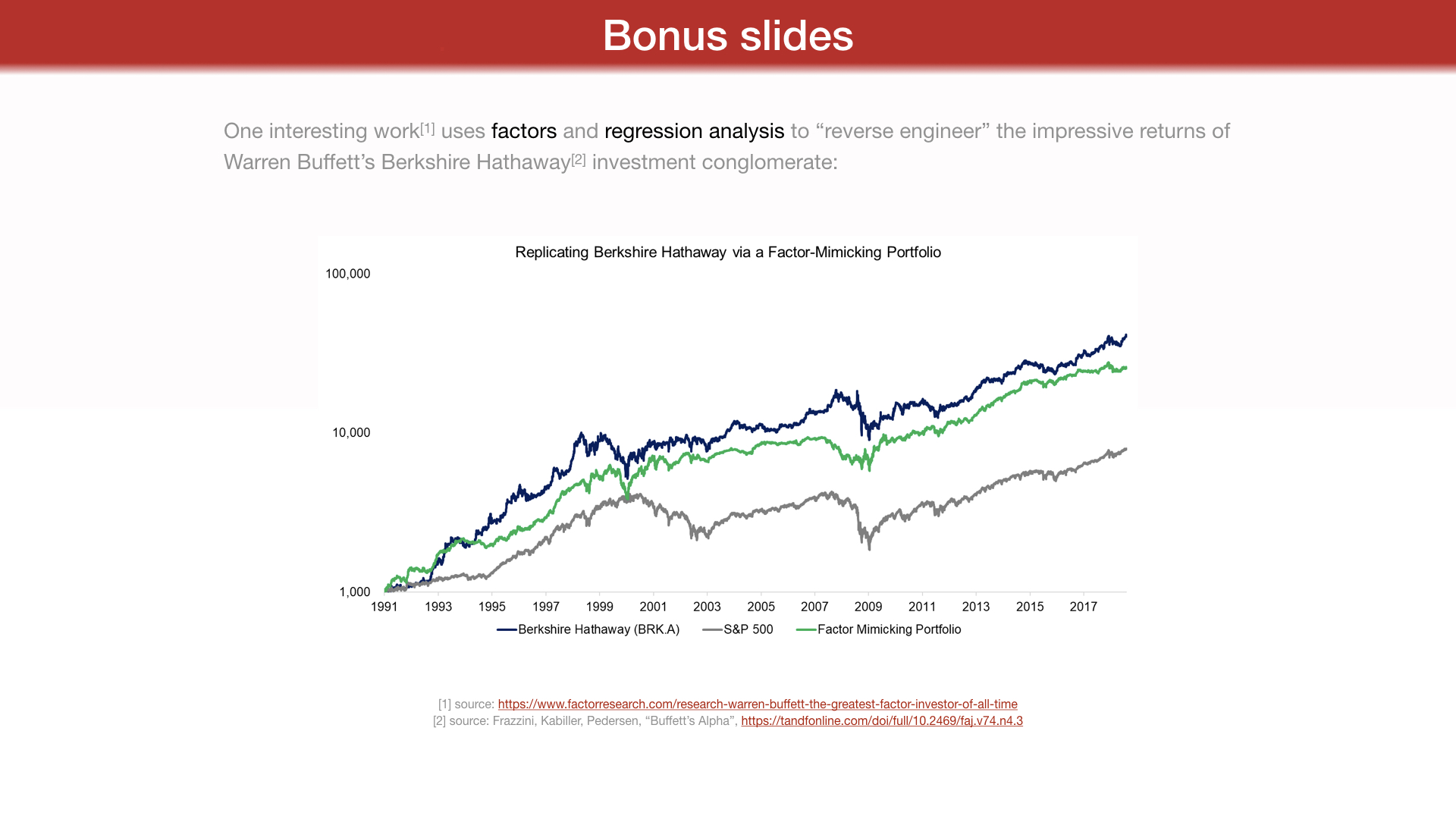 One interesting work[1] uses factors and regression analysis to "reverse engineer" the impressive returns of Warren Buffett's Berkshire Hathaway[2] investment conglomerate: